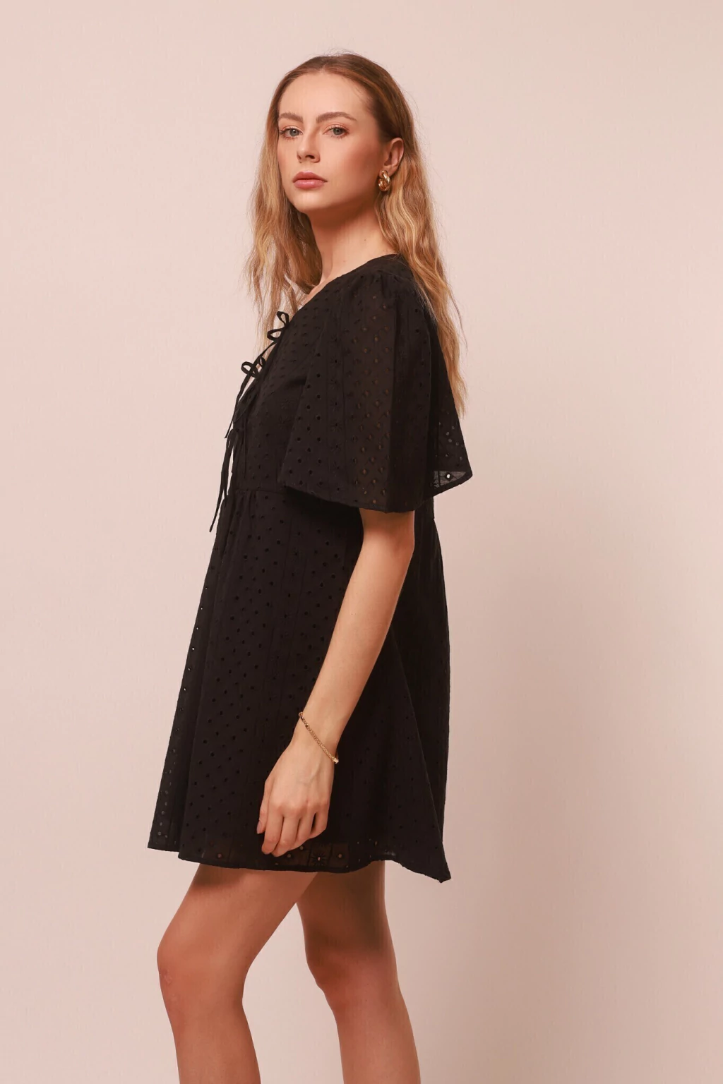 Vestido curto em voil de algodão bordado em laise preto, com forro em viscose, modelagem solta no corpo, com recorte na cintura, mangas volumosas e amarrações frontais. O vestido une uma modelagem tendência da temporada com um tecido clássico e atemporal. Com o comprimento ideal para o dia a dia, é a peça perfeita para compor visuais românticos ou descontraídos.
