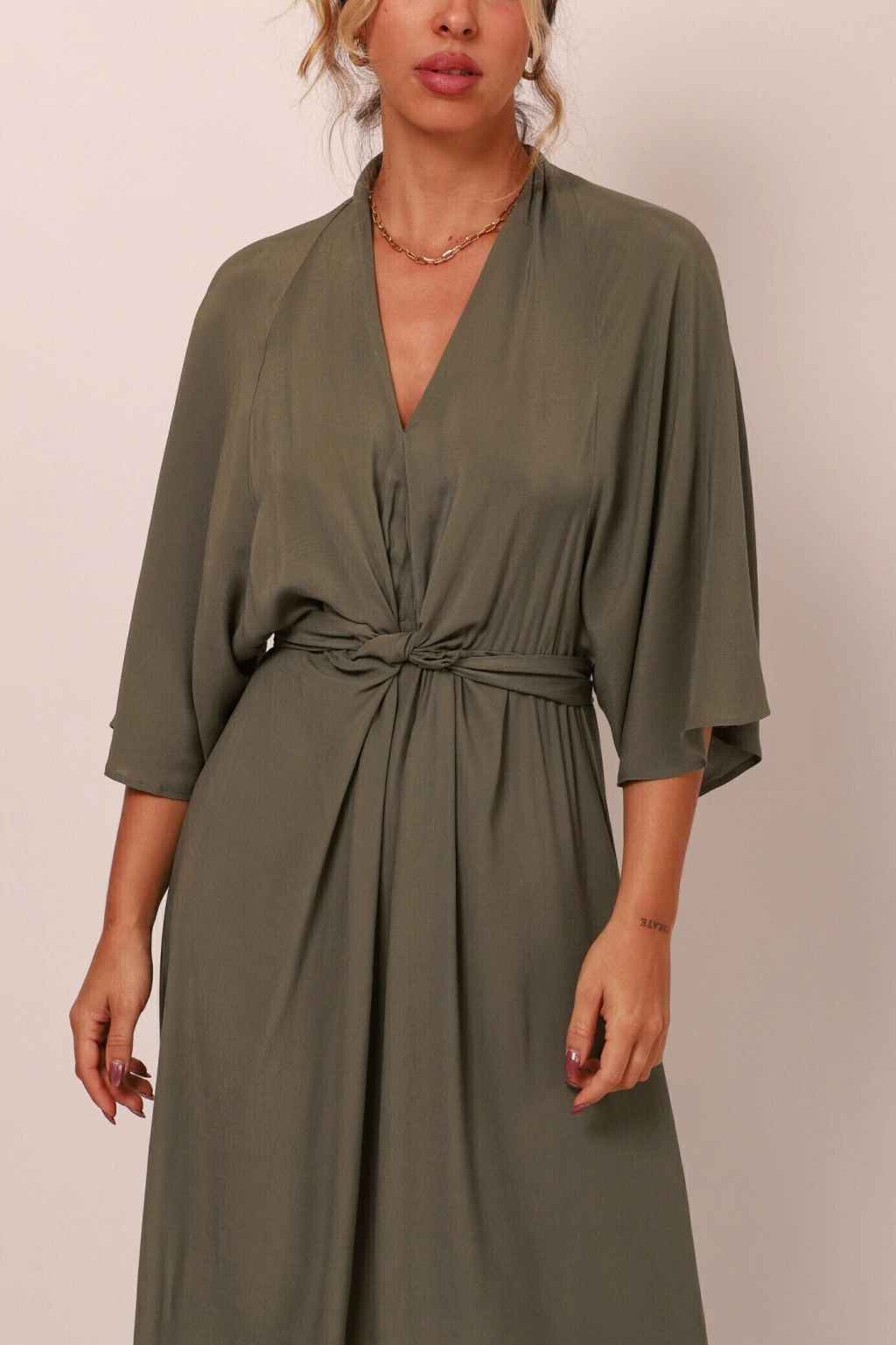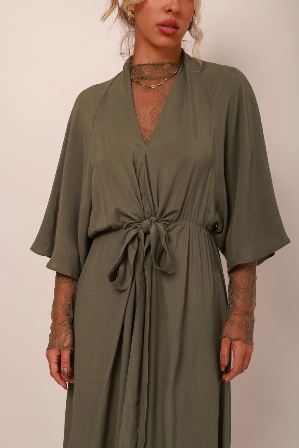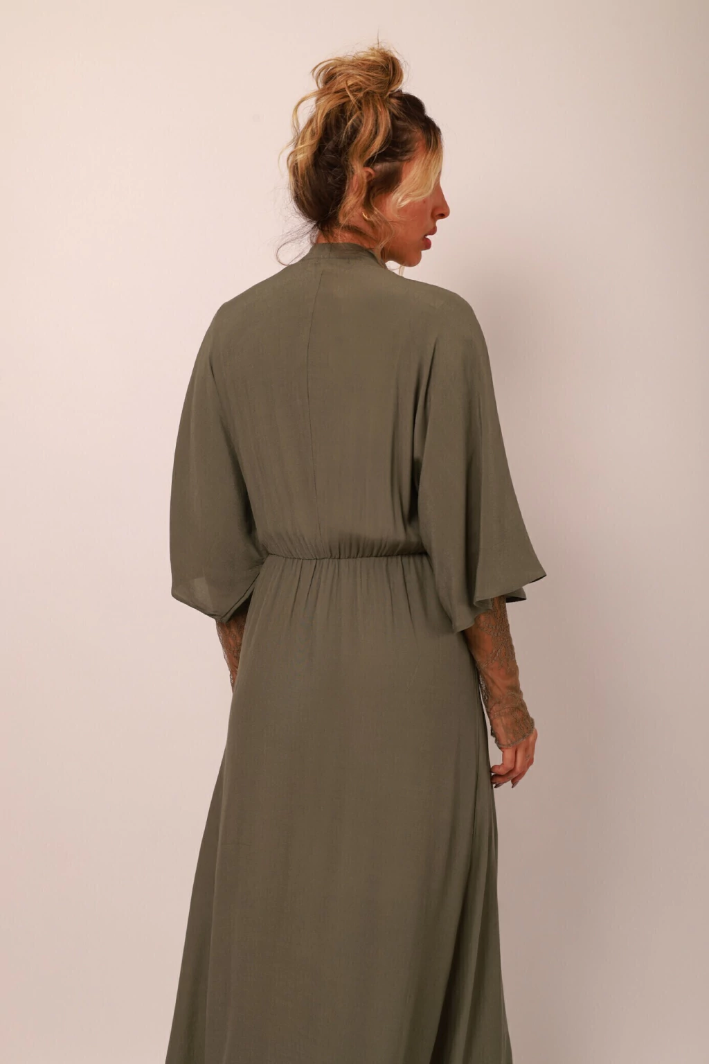 Nosso novo queridinho! Vestido longo, em crepe de viscose na cor Verde Oliva, com caimento perfeito, mangas kimono, decote em V e faixas para amaração frontal ou traseira. Modelo versatil para diferentes ocasiões, combine com acessórios, calçados e bolsas variados e descubra o potencial de composições que o vestido oferece. Ele transita com facilidade desde um almoço descontraído até eventos que pedem mais elegância.