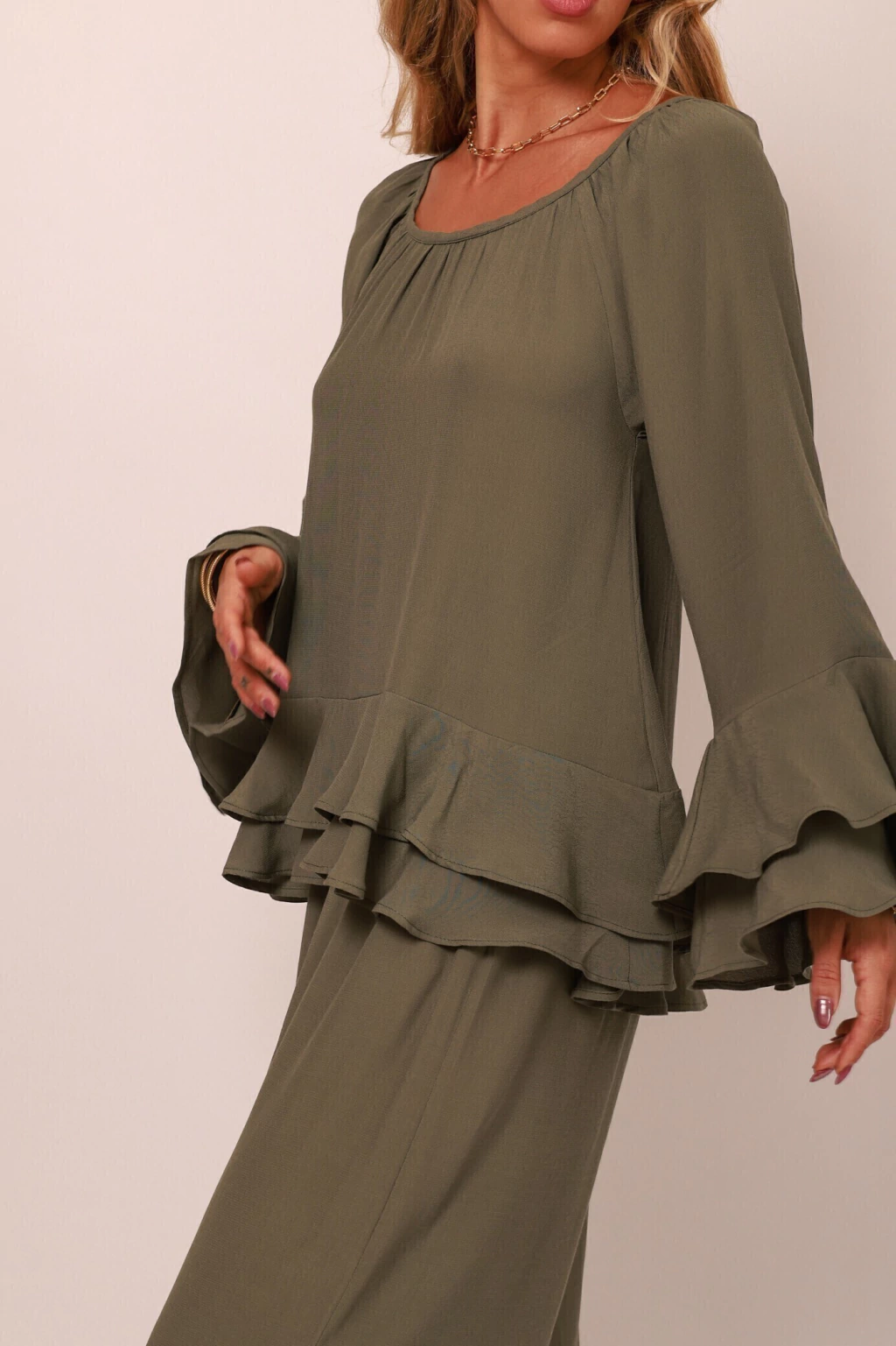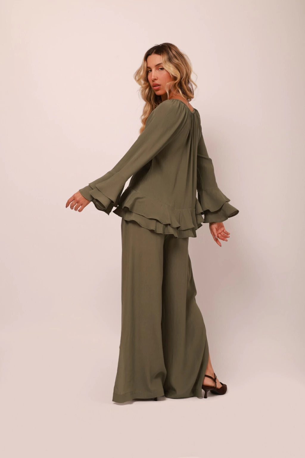 Blouse with long sleeves made of crinkled viscose in green. It features a boat neckline, sleeves, and hem with ruffles. The blouse has an excellent fit and is full of details that reflect the Boho Chic trend. For a monochromatic and stylish look, pair it with the Siena Green Pants. Go for this perfect outfit to wear as a set or separately.