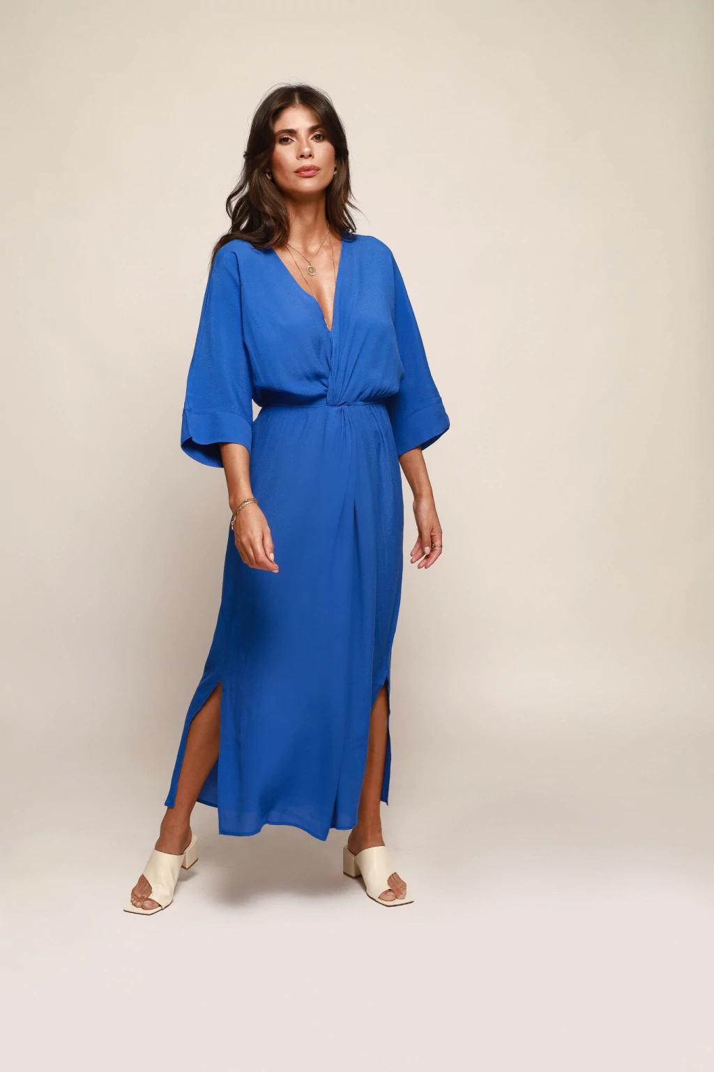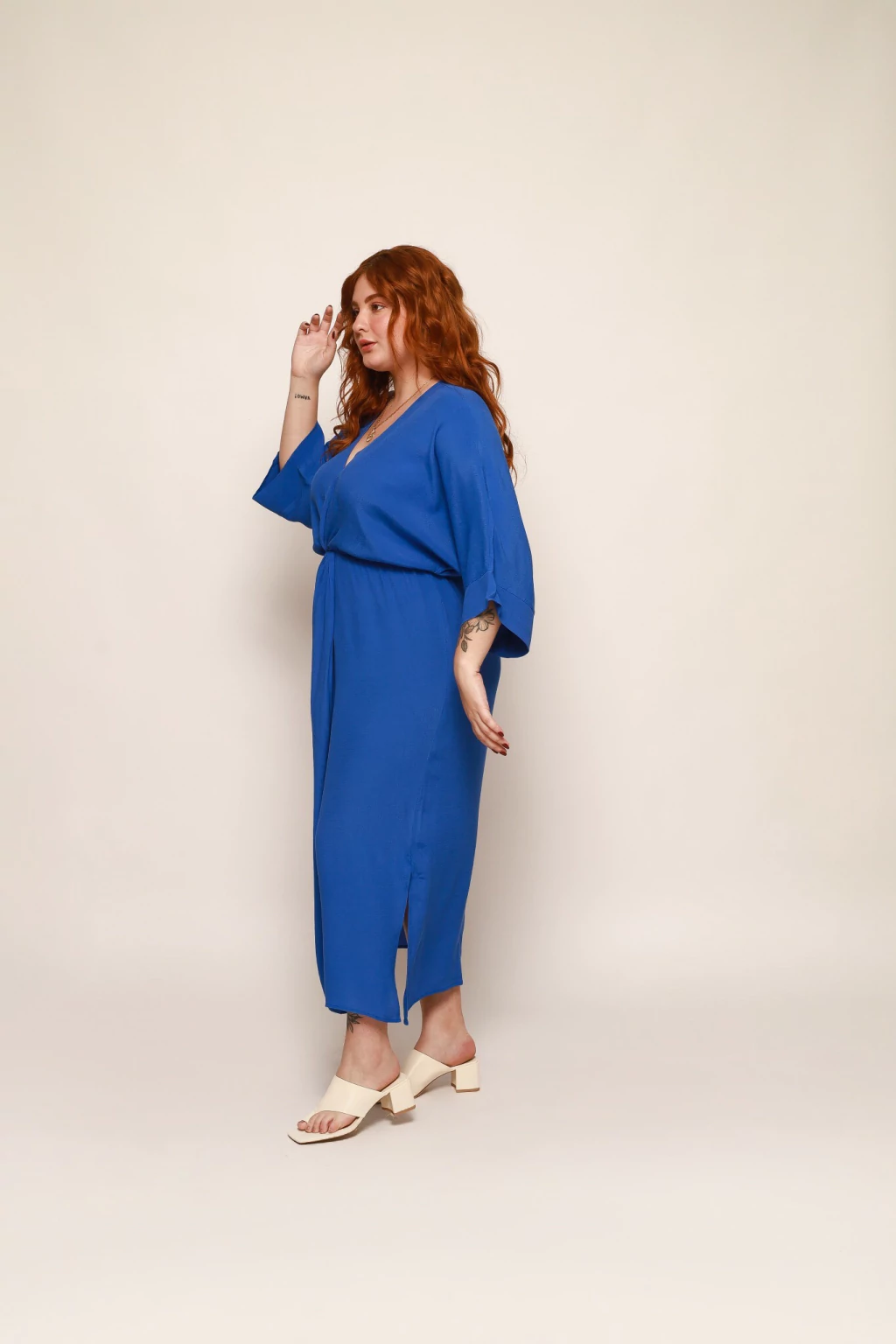 Our best-seller! This midi dress in blue viscose crepe offers a perfect drape, featuring a wrap-around top, elastic waist, and V-neckline at both the front and sides.